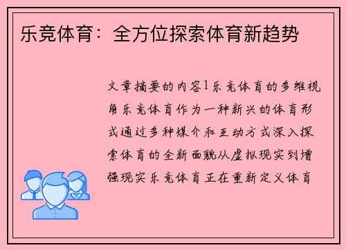 乐竞体育作为全方位探索体育新趋势的代表,不仅通过技术创新和体验设计重新定义了体育的未来,还在全球化、可持续发展和社会责任方面展示出了巨大的潜力。随着乐竞体育的不断发展和推广,它将继续在全球体育舞台上发挥重要作用,推动体育产业的进步和创新。
