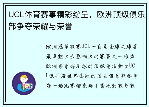 UCL体育赛事精彩纷呈,欧洲顶级俱乐部争夺荣耀与荣誉