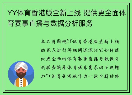 本文将围绕YY体育香港版全新上线的亮点进行详细阐述,探讨它如何提供更全面的体育赛事直播与数据分析服务。随着体育娱乐需求的不断增加,YY体育香港版作为一款全新的体育平台,突破了传统体育直播的局限,整合了更高效的赛事直播技术和精准的赛事数据分析功能,为用户带来前所未有的观赛体验。本篇文章将从四个方面详细介绍YY体育香港版的创新之处,包括:全面的赛事直播覆盖、实时精准的数据分析、智能化的用户体验、以及个性化的订阅与推送服务。通过这些创新,YY体育香港版不仅满足了普通用户的观赛需求,也为专业人士和分析师提供了强有力的辅助工具。